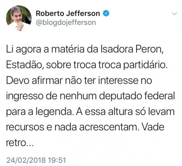 Mensagem postada pelo dirigente do PTB no país, ex-deputado federal carioca Roberto Jefferson, dá o tom do partido nesse momento crucial de notícias e especulações sobre mudanças partidárias.